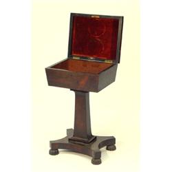 Victorian rosewood caddy shaped workbox on a tapering column supported by quadfoil platform and shaped feet
