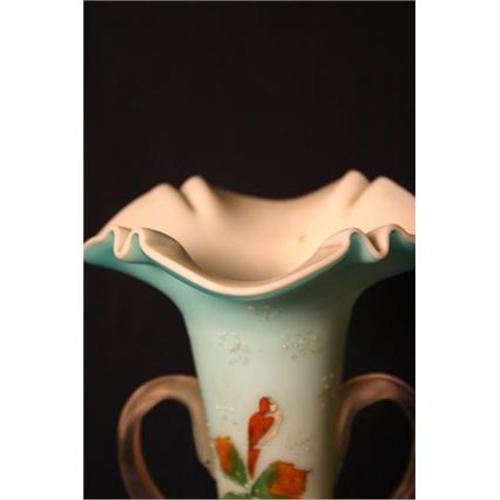 This stunning hand blown Victorian style vase would make a prized addition to any collection. Set atop a carved wooden base this elegant work of art stands an impressive 11 ¾ inches. The subtle shift from soft blue to white is accentuated by its feminine curves and fluid handles. The opaque body is beautifully decorated with hand painted flowers and birds in complementary orange and red hues. Small pearl like details add a three dimensional texture to this otherwise smooth piece. This unique work or art is affordably priced and would make a prized addition to any collection. Shipping cost includes insurance.