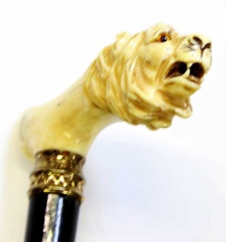 Victorian walking stickwith ivory carved lion head handle on black wood shaft, 36", condition is fine. Est. 400-800