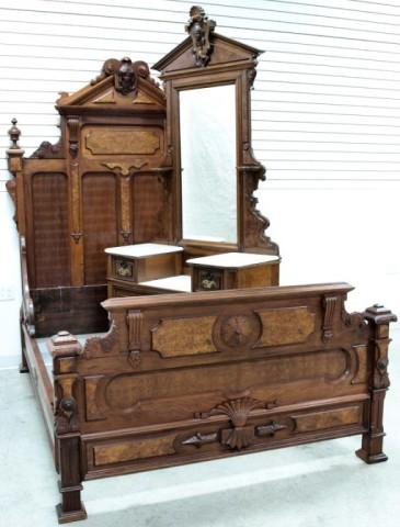 featuring marble top and carved maidens upper crest. Measures 85" tall X 65" wide X 82" long (bed).