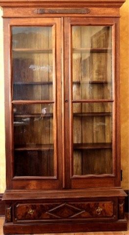 on single drawer base with 4 adjustable shelves and burl accents, 19" X 42" X 78", C. 1880's, remains very good condition. Frawley Estate item. Est. 500-1000