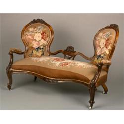 Victorian walnut drawing room settee, the double balloon back with carved foliate crests, scroll arms and foliate decorated cabriole supports, needlework upholstery - see illustration