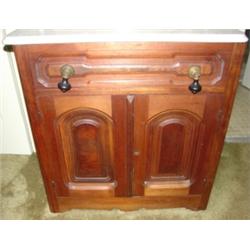 Victorian walnut marble top washstand with splash back. Measures 28" high and 27" wide across top. Has one drawer with tier drop pulls and two doors on bottom.