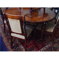 Victorian walnut wind out dining table with extra leaf on ring turned legs and six matching dining chairs with carved backs and upholstered stuff over seats