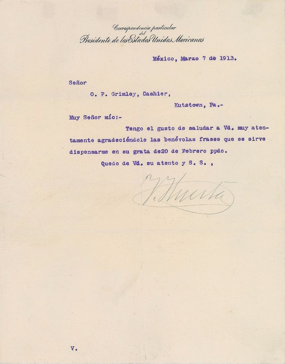 Military officer and former president of Mexico (1850–1916). TLS signed “V. Huerta,” one page, 8 x 10.25, Presidente del los Estados Unidos Mexcianos letterhead, March 7, 1913. Untranslated letter of appreciation to O. P. Grimley. In fine condition, with mounting remnants to reverse.
