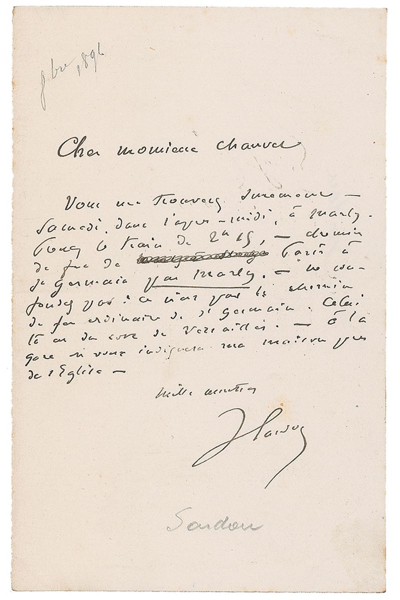 French dramatist (1831–1908) who wrote several plays that were made into popular 19th-century operas such as La Tosca. Untranslated ALS in French, signed “V. Sardou,” one page, 3.75 x 6, no date. In fine condition, with small pencil notations to top and bottom of page.