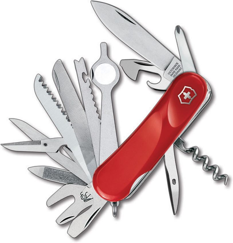 "Victorinox" Victorinox Item Number: VN25383E SRP: $89.95 3 3/8" overall. Features blade, nail file with nail cleaner, lever design serrated edge scissors, can opener with small screwdriver, cap lifter with large locking screwdriver and wire stripper, wood saw, Phillips locking screwdriver, metal file, metal saw, magnifying glass with precision screwdriver, universal wrench, fish scaler with hook disgorger, corkscrew, punch, reamer, tweezers, toothpick, and keyring. Red handles. Weight: 0.35lbs Country of Origin: Switzerland