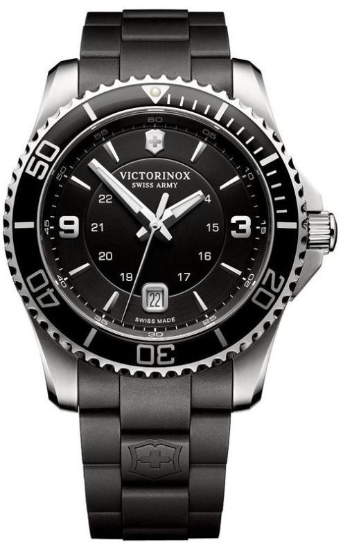 Model: 241698 - CASE = [Material:Stainless Steel], [Case Diameter:43], [Case Thickness:12.2mm], [Bezel:Uni-Directional Rotating], [Case Back:Solid], [Water Resistant:100 Meters - 330 Feet], [Crystal:Scratch Resistant Sapphire], DIAL = [Color:Black], MOVEMENT = [Type:Quartz], [Crown:Push In], BAND = [Clasp:Tang], [Type:Black Rubber], (In Stock - Ready to ship.)