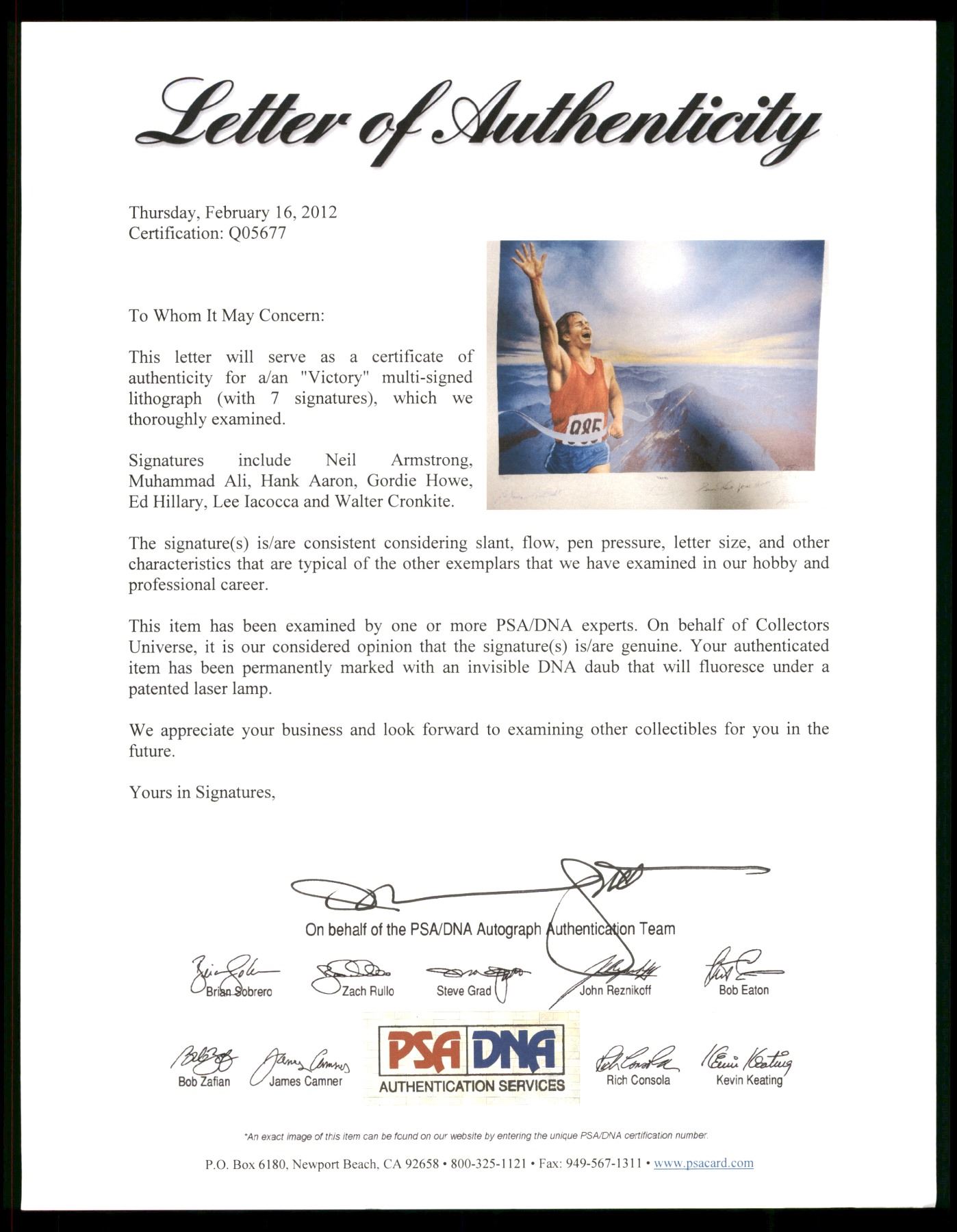 This is a Framed 19x22 Lithograph Photo, approximately 27x30 with the frame, that has been hand signed by Neil Armstrong, Muhammad Ali, Hank Aaron, Gordie Howe, Ed Hillary, Lee Iacocca, & Walter Cronkite. This item is artist proof and is autographed by the artist. This is a limited edition item that has been serial numbered #/100. This item has been certified authentic by PSA/DNA