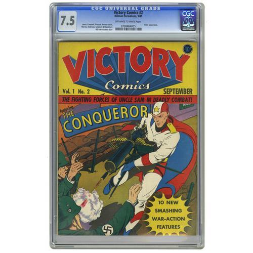 <B>Victory Comics #2 (Hillman Publications, 1941) CGC VF- 7.5 Off-white to white pages.</B></I> Timely fans need to take note of this scarce comic from Hillman, featuring cover and story art by <B>Marvel Mystery</B></I> mainman Bill Everett. This is a very colorful World War II comic featuring an appearance by Adolf Hitler, published just prior to America's involvement in the conflict. It's only the third copy to be certified by CGC to date, and it ranks as best of the three. Overstreet 2006 VF 8.0 value = $813. CGC census 3/06: 1 in 7.5, none higher.
