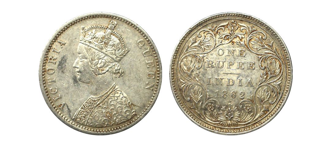 Victroia Queen, Silver Rupee, 1862, A/II,1/6(2+4) dots, struck on earlier used dies of 0/6 dots, very rare.