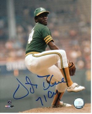 Vida Blue was a power pitcher that worked fast and pounded the strike zone. He possessed a breaking curveball that he threw on occasion and an above average change-up, but his signature pitch was a blistering fastball that dialed up to nearly 100 miles per hour. He no-hit the Minnesota Twins, 6-0, at Oakland-Alameda County Coliseum, with the lone baserunner being Harmon Killebrew, who walked in the fourth inning. Blue had a 24-8 record in 1971, winning both the Cy Young and MVP awards. Vida Blue has hand autographed this Oakland A's 8x10 Photo with 71 CY inscription. Certificate of Authenticity from Athlon Sports.