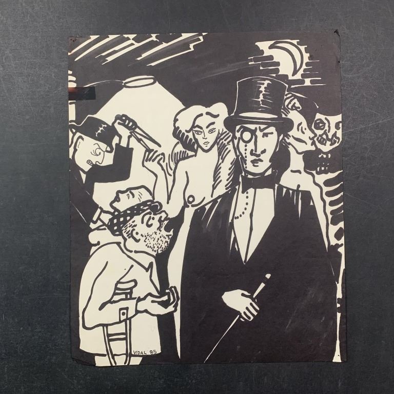 Vidal 85, Unknown Title, Original Drawing on Paper. A man on crutches asks a wealthy man for money while another man is about to commit murder. A nude woman looks on. There is a small tear on the left edge but otherwise in good condition.