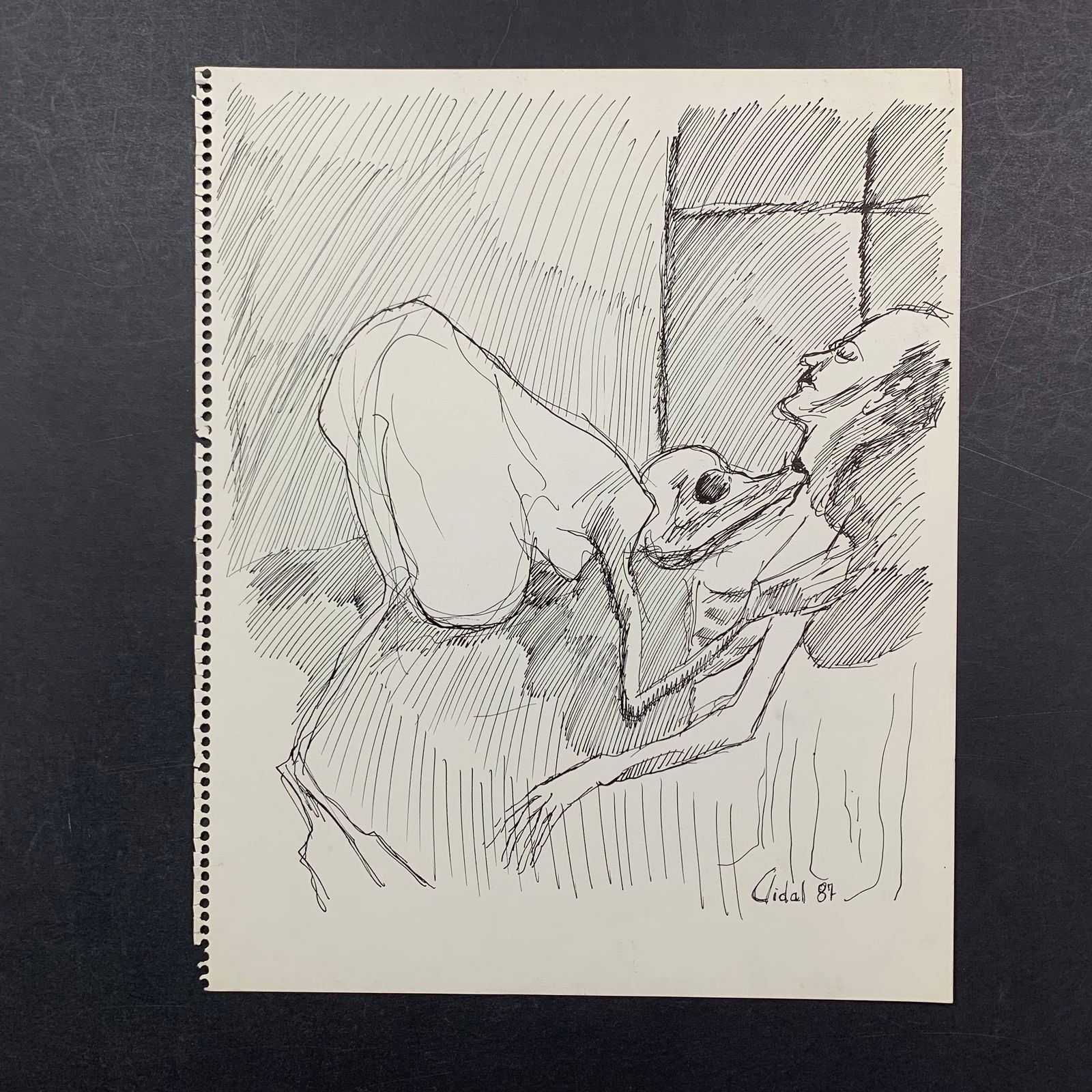 Vidal Alcolea, Untitled, Original Sketch. This black and white ink sketch depicts a lifeform, taking the lifeforce of a bedridden man. It is signed in the lower right corner.