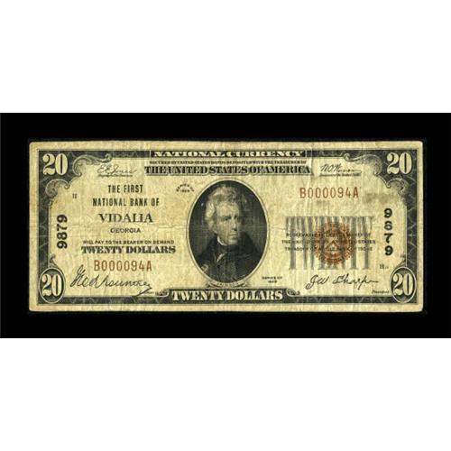 <B>Vidalia, GA</B></I> - $20 1929 Ty. 1 <B>The First NB</B></I> Ch. # 9879<BR> This piece was first sold in our 2004 Central States Auction where it was described, "An extremely rare bank in small size, with just two such examples reported in the Kelly census. Even the massive Georgia collection we sold in January (2004) lacked any small note from here, although it contained two large examples from this bank. Evenly circulated <B>Fine.</B></I>" There are now four small size notes known, but the collectors are still lined up to acquire this piece.<BR><I>From The Amelia Island Collection.</B></I><BR><BR><b>Shipping:</b> Coins & Currency (<a target="_blank" href="http://www.heritageauctions.com/common/shipping.php">view shipping information</a>)