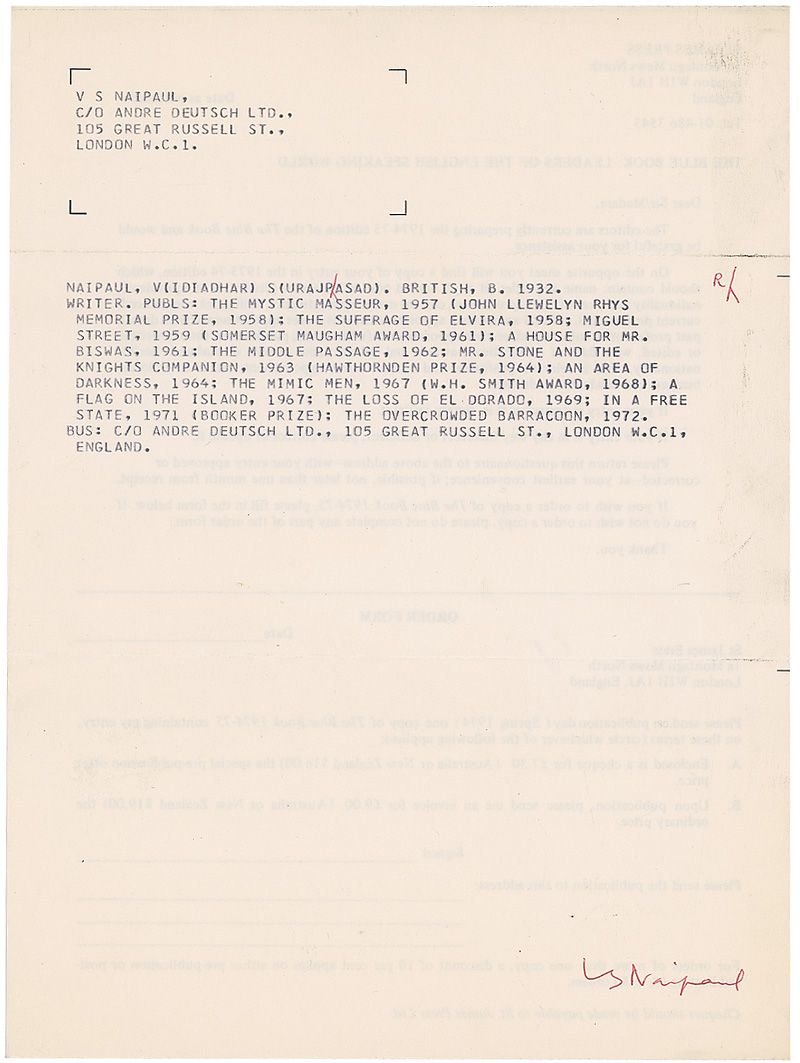 British writer and winner of the 2001 Nobel Prize in Literature. DS, signed “V. S. Naipaul,” two pages, 8.25 x 11, 1974. A document from St. James Press requesting confirmation of the accuracy of Naipaul’s entry in The Blue Book: Leaders of the English Speaking World. Naipaul corrected the spelling of his name and signed the bottom. In fine condition, with scattered light creases and wrinkling, and light soiling to the right side.