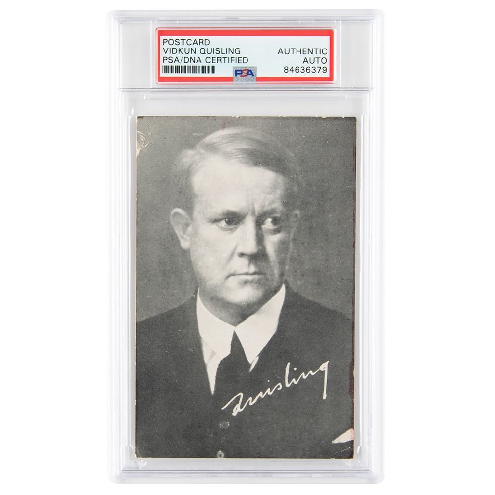 Vintage 3.25 x 5.25 postcard photo Quisling in a suit and tie, signed and inscribed on the reverse in bold ink, "Mr. Kenneth E. Kendall, Quisling, 14.5.41.†The front also bears his facsimile signature in white. In fine condition. Encapsulated in a PSA/DNA authentication holder.