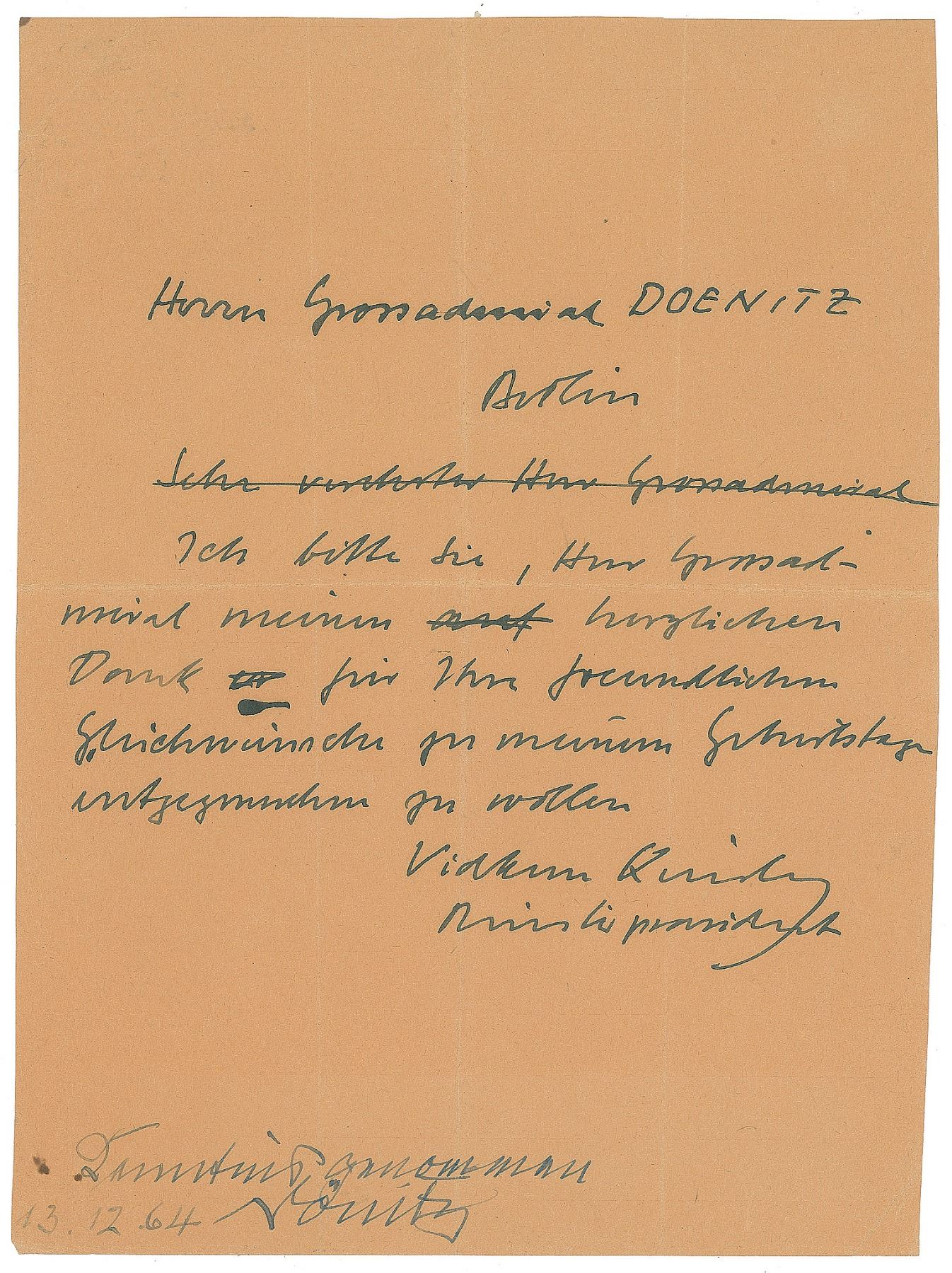 Draft ALS in German, signed “Vidkun Quisling, Minister President,” one page, 8 x 10.5, no date. Letter addressed to "Great Admiral Doenitz, Berlin," in full (translated): "I ask you, Great Admiral, to accept my cordial thanks for your friendly congratulations on my birthday." Endorsed in the lower left, "Duly noted, 13.12.64, Donitz." In fine condition, with several intersecting folds. Given the mistakes and corrections in this letter, it appears as though it was a draft, perhaps retained by Quisling. It may have been presented to Donitz long after Quisling's death, which would explain the 1964 endorsement date. Quisling (1887–1945) was a Norwegian politician who served as prime minister of Norway during the Nazi occupation in WWII.