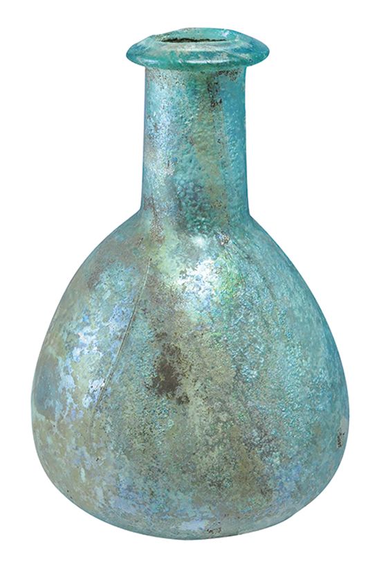Vidrio (S. II-III d.C.). Recipiente con irisaciones. Altura 14,8 cm.