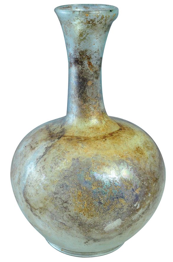 Vidrio (S. II-III d.C.). Recipiente de tonalidad ámbar con irisaciones. Altura 14,5 cm.