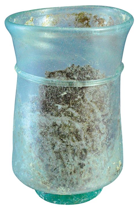 Vidrio (S. II-III d.C.). Vaso con irisaciones. Altura 10,0 cm. Diámetro 6,7 cm. Decorado con anillo de pasta vítrea en la boca.