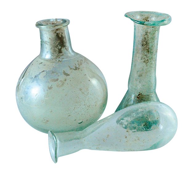 Vidrios (S. II-III d.C.). Lote tres ungüentarios con irisaciones. Altura 6,5; 6,8 y 7,1 cm.