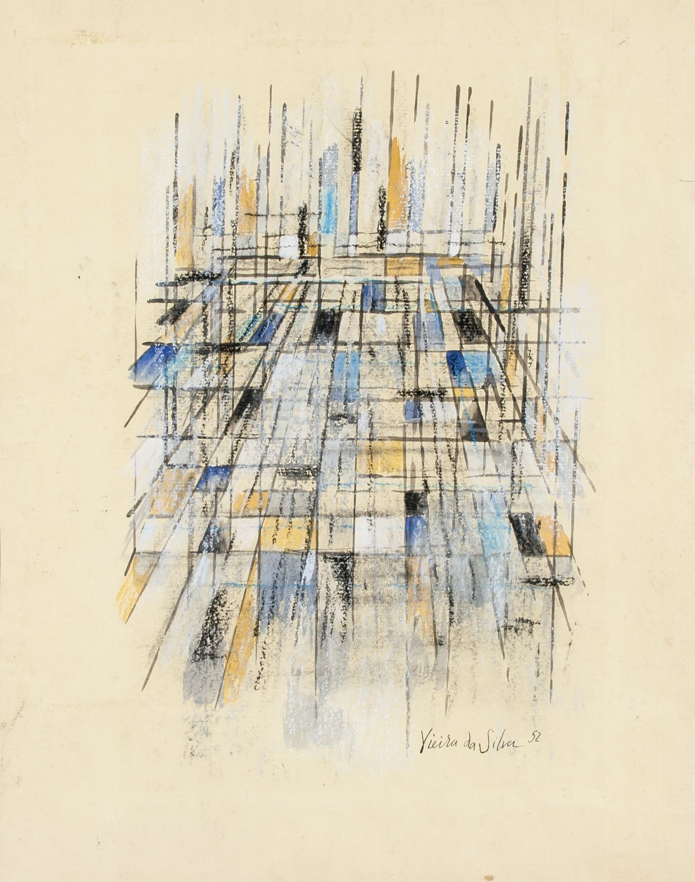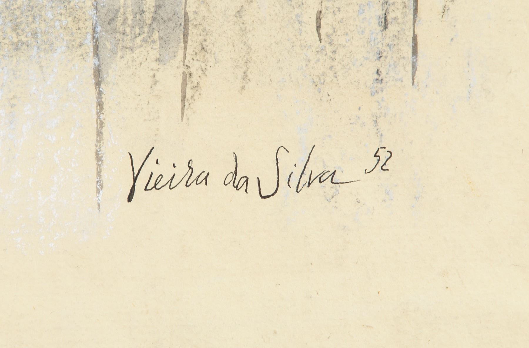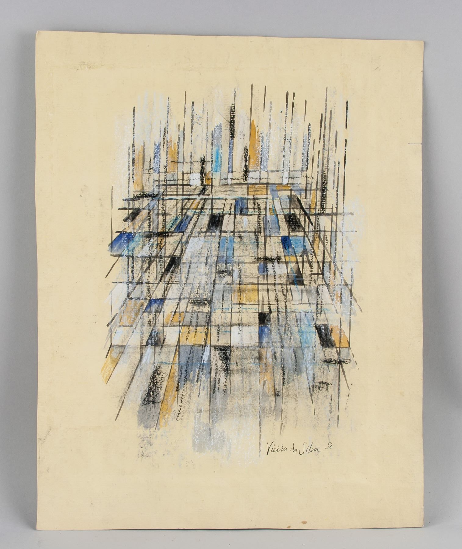 Mixed media on paper. Signed and attr. Maria Helena Vieira da Silva (Portugese, 1908–1992) on bottom right corner. 17.5 x 14 inch (44.5 x 35.6 cm). Maria Helena Vieira Da Silva rose to prominence as the best known Portuguese artist—and one of the few women—on the post-World-War II Paris art scene, and became the first female artist to receive the French government’s prestigious Grand Prix National des Arts in 1966. Within this “School of Paris,” as it was called, Vieira Da Silva represented a unique approach that was less gestural and more geometric than the dominant Art Informel style. She melded her early schooling with the French Cubist Fernand Léger with other modern styles, like Futurism and Constructivism, to create paintings that resembled abstracted urban grids and united multiple perspectives into a fractured sense of space. PROVENANCE: Private collection, Toronto, ON