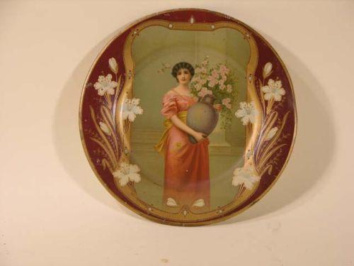 Vienna art plate, shows pretty lady standing holding large vase of flowers. Good condition, great colors, tin, 9.5" diameter.