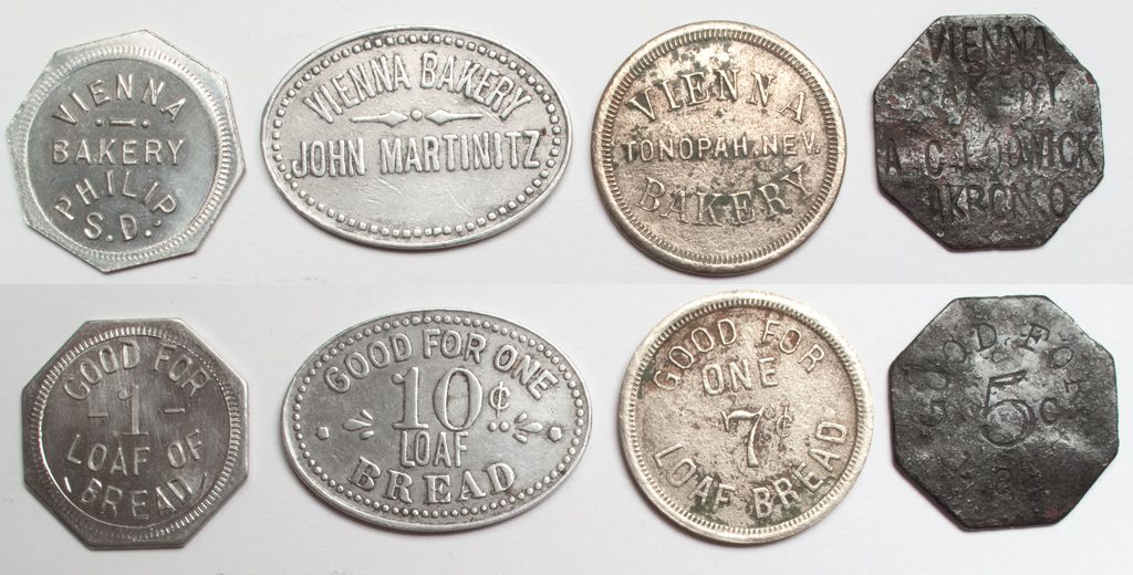 Lot of 4. 1) Tonopah, Nevada GF one 7c loaf of bread. 2) Philip, South Dakota. GF one loaf of bread. 3) Bucyrus, Ohio. John Martinez Bakery. GF one 10c loaf of bread. 4) Akron, Ohio. AL Loowick(?). Good for 5c loaf. Last token is rough, but others are in good condition. City: County: State: Date: