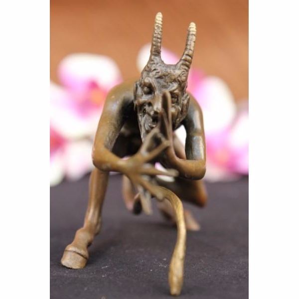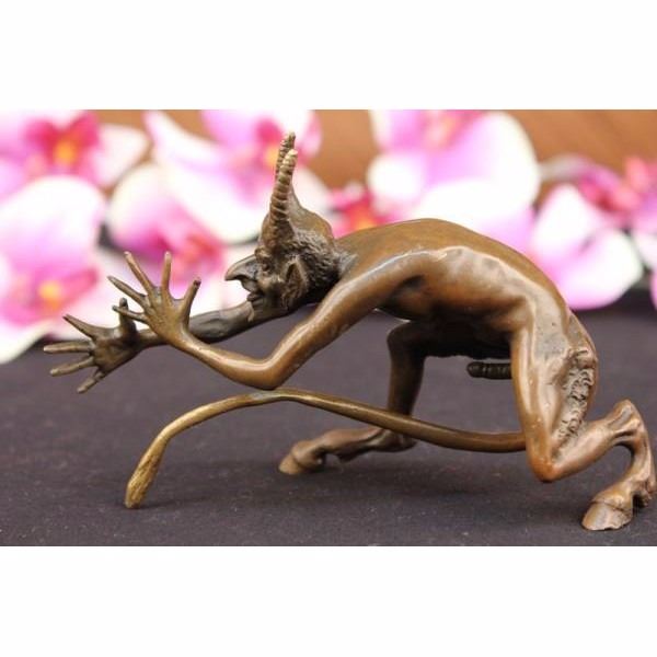 This creepy and very scary satyr is chasing around a nymph, but she is not interesting in him and his overly persisting arouse self. She is happy with her main Satyr, but has not taking no for an answer chasing her all around. His arms and hands are extended and spread out as he is trying to grab something or someone. His devil face and horns are very frightening to look at. This Satyr mythological creature could not be completely understand. This sculpture is made from solid bronze and was casted using the "Lost Wax Method". It has a brown patina for preservation. Condition: This sculpture is in perfect condition. Bronze Dimensions :Height 3 1/2" x Width 5 1/2" Weight : 2 LBS Inventory :25RL0151752