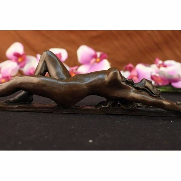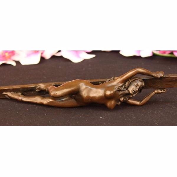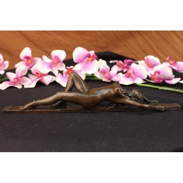 This erotic woman rest atop a long wooden stick tide up from the wrist and one leg, she lays there helpless and nude, but her astonishing and gorgeous beauty cant help but want to keep staring. Perfect for your desk, or at a Dinner Party, or maybe, a special treat, just for yourself!A stunning creation with exquisite detail cast by the traditional lost wax or hot cast method this is not to be confused with cheap imitations. This is a Limited edition and signed by artist Jean Patou In perfect condition. Condition: This sculpture is in perfect condition. Bronze Dimensions :Height 11" x Width2 1/2" Weight : 4 LBS Inventory 53ST0262435