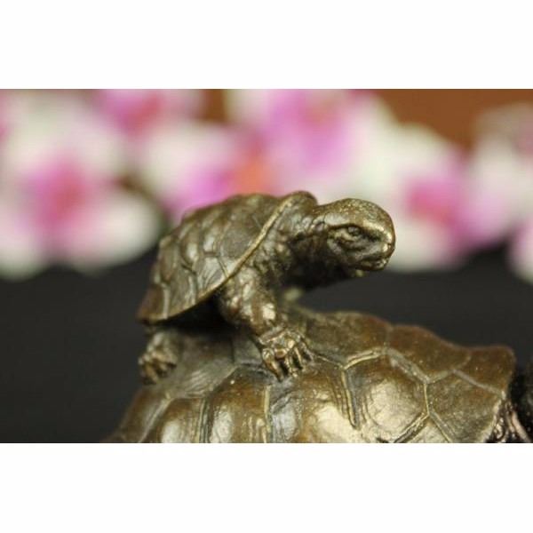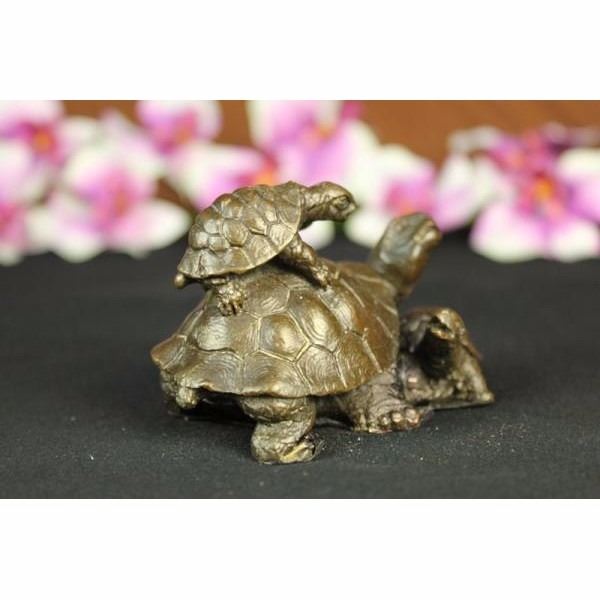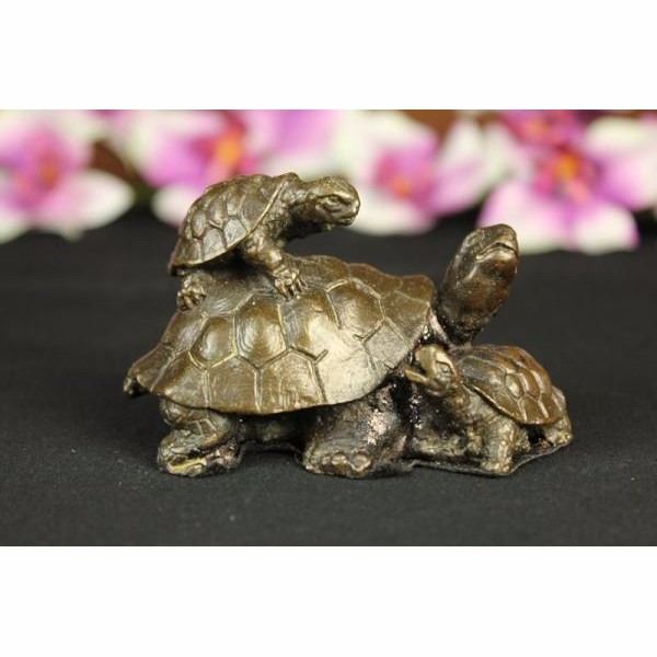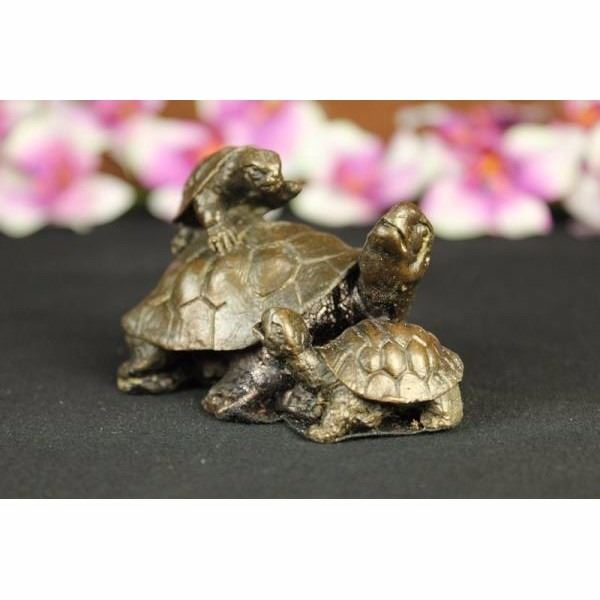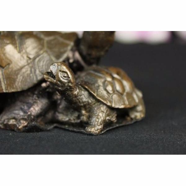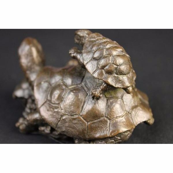 The turtle trio can be imagined clambering up each other's backs trying to get to the best spot on a fallen tree to sun-bathe. The larger of the turtles situated in the middle, tries to look behind him at a small turtle climbing his hard shell. Animal symbolism of the turtle are, order, creation, patience, strength, stability, longevity, innocence, endurance, and protection. The bronze sculpture was captured using the age-old method of lost-wax casting and stained with a brown patina finish for preservation. Condition: This sculpture is in perfect condition. Bronze Dimensions :Height 3 1/2" x Width 4" Weight : 1 LBS Inventory 98Y2471689