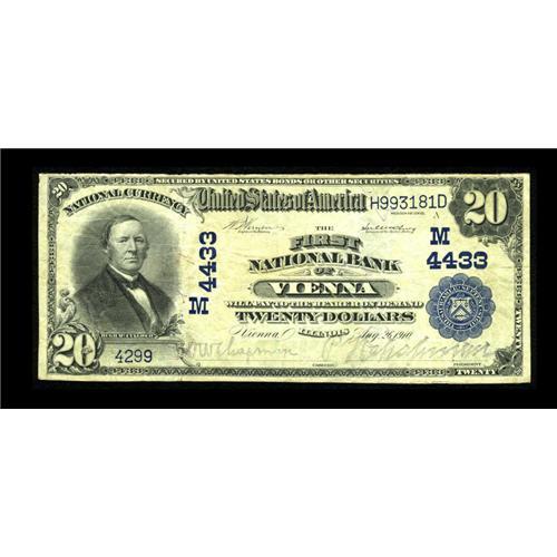 <B>Vienna, IL</B></I> - $20 1902 Plain Back Fr. 653 <B>The First NB</B></I> Ch. # (M)4433<BR>Eight large size notes are known for this Johnson County issuer. Lightly stamped signatures grace this issue which is a survivor of the $3130 in large size left outstanding. <B>Fine.</B></I><BR><I>From The Lincoln Collection</B></I><BR><BR><b>Shipping:</b> Coins & Currency (<a target="_blank" href="http://www.heritageauctions.com/common/shipping.php">view shipping information</a>)
