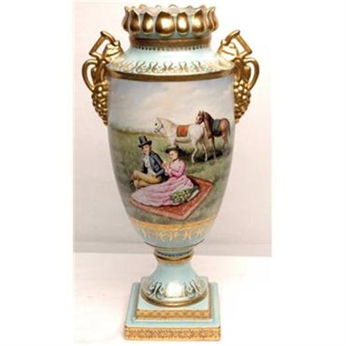 Vienna Porcelain Tall Vase w/Two Handles and Figural Decor. Light blue background with gold trim on handles and edges. There is a picnic scene on each side of the vase. One side with a couple on a picnic blanket and 2 horses in the background. The opposite side with a carriage and beautiful ladies. Marked with beehive on bottom. 25.5" tall, 7.5" square base, 13" wide. Early 20th C.