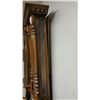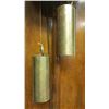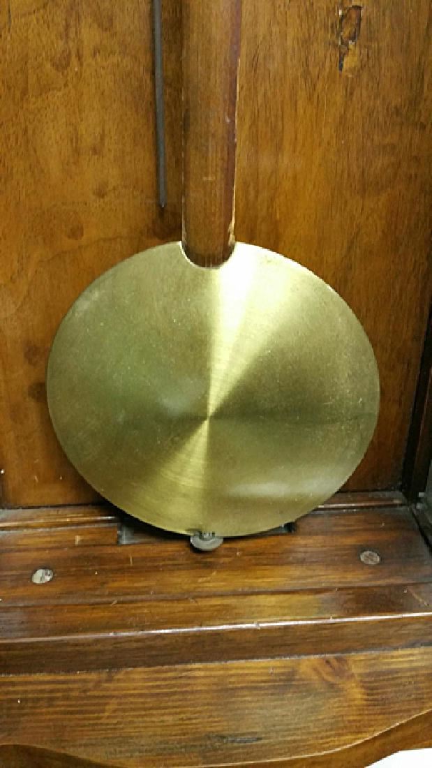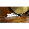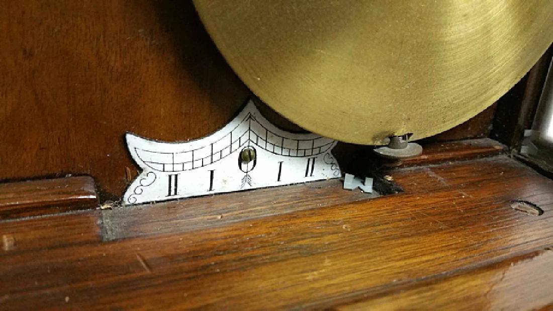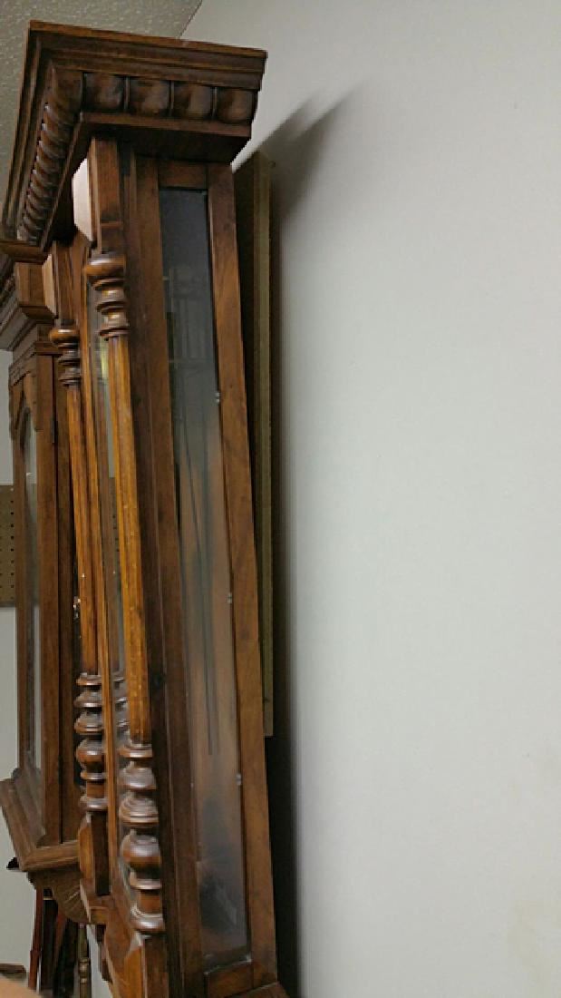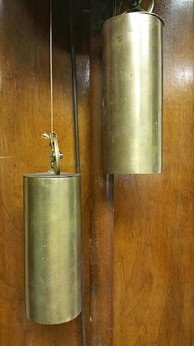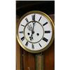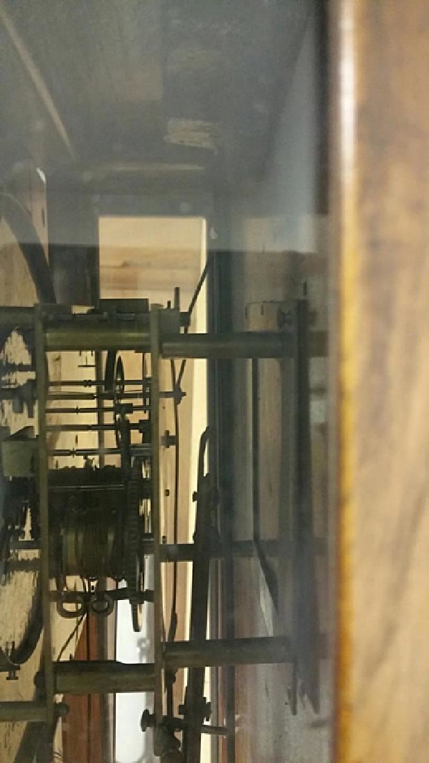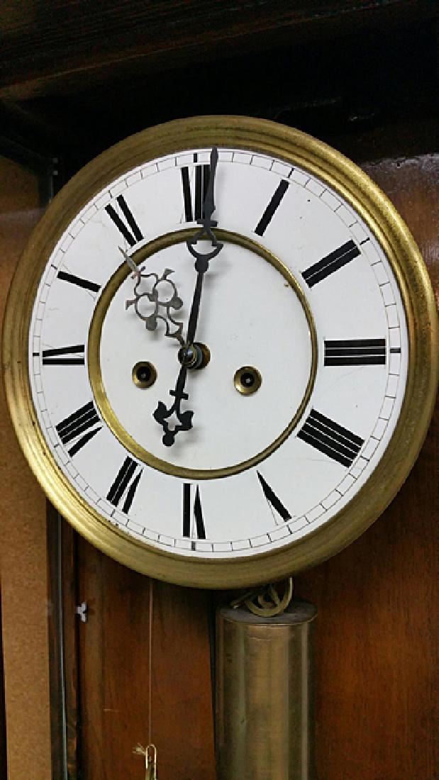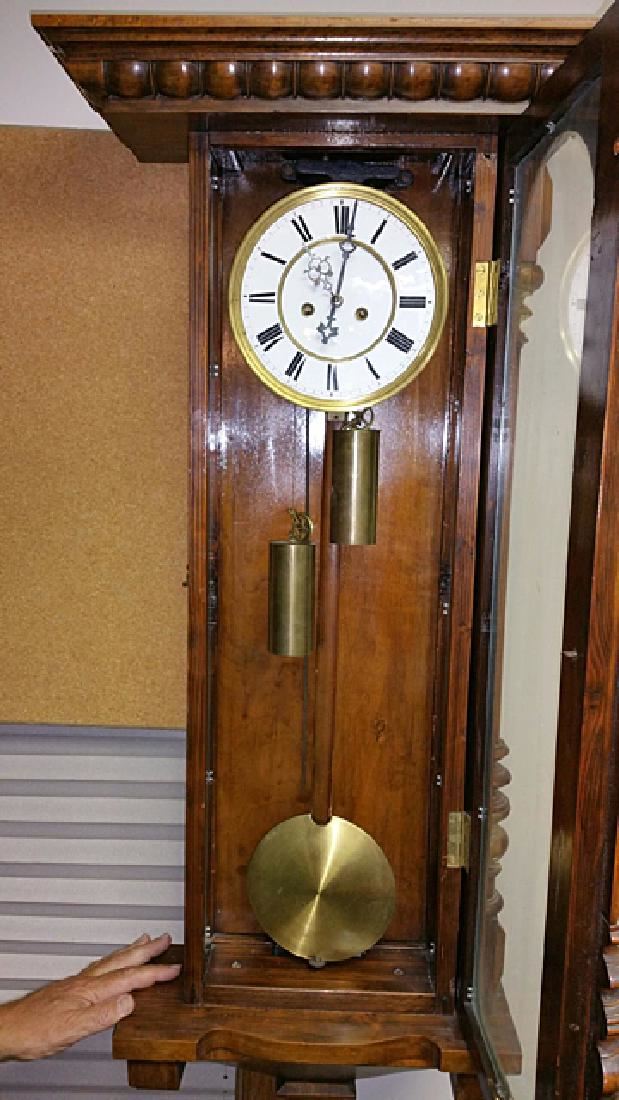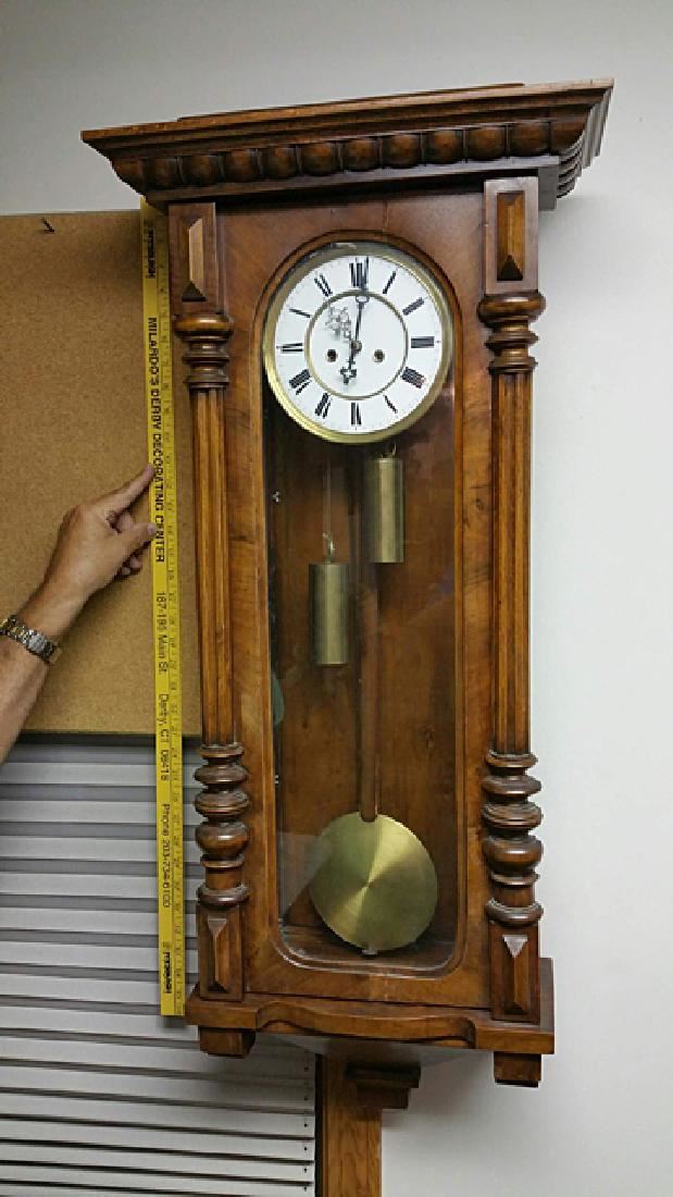 Vienna Regulator clock, with turned columns, 2 weights, porcelain dial, pendulums, burl walnut case, glass sides, original pullies that hold the weights. Original porcelain marker behind the pendulum.