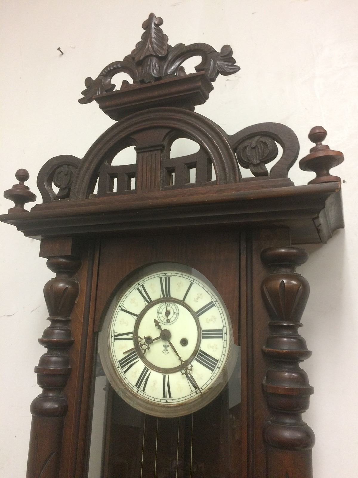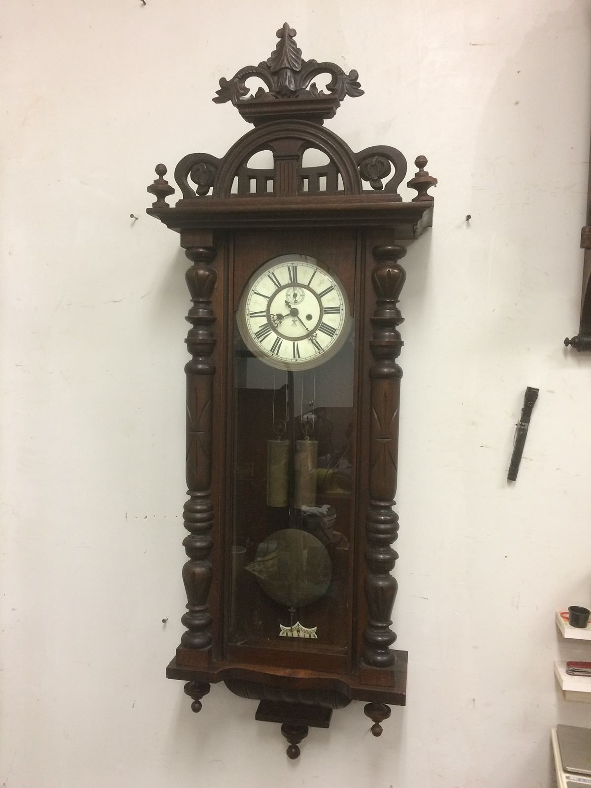 Vienna Regulator Wall Clock with very ornate top. Weight driven, exceptional carving, beautiful clock. Was in running condition at the estate