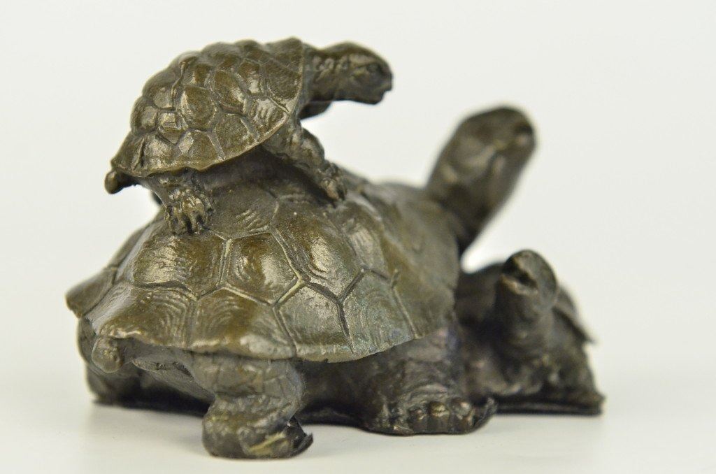 The turtle trio can be imagined clambering up each other's backs trying to get to the best spot on a fallen tree to sun-bathe. The larger of the turtles situated in the middle, tries to look behind him at a small turtle climbing his hard shell. Animal symbolism of the turtle are, order, creation, patience, strength, stability, longevity, innocence, endurance, and protection. The bronze sculpture was captured using the age-old method of lost-wax casting and stained with a brown patina finish for preservation. Bronze Dimensions: Height 4 X Width 4 inches. Weight: 1 LBS. Inventory: 98Y2471689