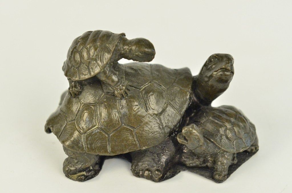 The turtle trio can be imagined clambering up each other's backs trying to get to the best spot on a fallen tree to sunbathe. The larger of the turtles situated in the middle, tries to look behind him at a small turtle climbing his hard shell. Animal symbolism of the turtle are, order, creation, patience, strength, stability, longevity, innocence, endurance, and protection. The bronze sculpture was captured using the ageold method of lostwax casting and stained with a brown patina finish for preservation. Bronze Dimensions: Height 4 X Width 4 inches. Weight: 1 LBS. Inventory: 98Y2471689