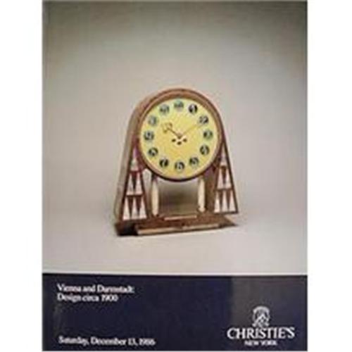 Vienna and Darmstadt: Design Circa 1900, auction catalogue from Christie's, New York, December 13, 1986. 4to, pictorial softcover, 64 pages (587 lots), illustrated in black and white and color, very mild general wear, near fine overall. Scarce. <p> This important auction, devoted to the Secessionist, Jugendstil, and related design movements, included paintings and drawings, prints and graphics, sculpture, glass, tableware, metalwork, furniture, clocks, and decorative objects. Among the artists, studios, and makers represented are Josef Hoffmann, Wiener Werkstatte, Wachtersbach, Wilhelm Kagel, Wiener Kunstkeramische Werkstatte, Wiener Keramik, Hans Christiansen, Franz Stuck, Egon Schiele, Carl Otto Czeschka, Kolomon Moser, Berthold Loffler, Loetz, Theodor Fahrner, Josef Maria Olbrich, Hagenauer, Milla Weltmann, Josef Urban, Adolf Loos, Otto Prutscher, Thonet, and others.