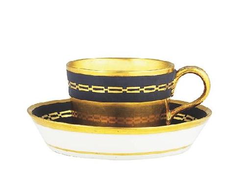 Gilt porcelain. Saucer with rosette in the middle, geometrical painted decoration on the rim. Marked: under glaze blue striped shield and pressed 807, 47 and 60 numbers. Vienna, 1807. Size: 5 cm Diameter: 12 cm