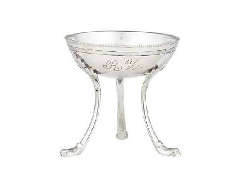 Silver, 84 g. Round bowl decorated with rolled motif and with notched rim, three cast feet with acanthus leaves and lion paws. Engraved initials of the owner: cursive R Z . Marked: Vienna, circa 1810, Viennese tax stamp 1810-1824, Lorenz Wieninger. Reitzner: P. 135 ill. Neuwirth: P. 1918. Size: 7 cm