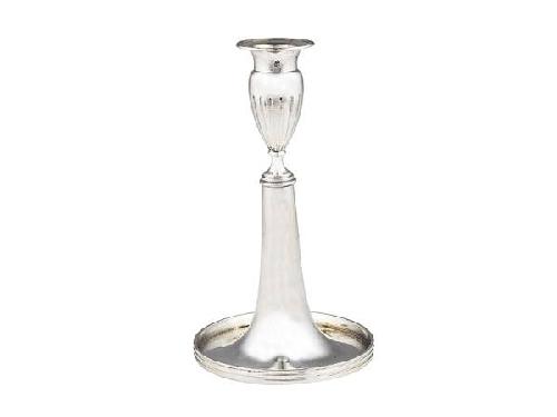 Silver, 212 g. Round base and cornet-shaped stem with fluted standing rim. Vase form candle cap. Marked: Vienna, 1801, undecipherable hallmark, tax stamp from Lemberg 1806/07. Size: 17 cm