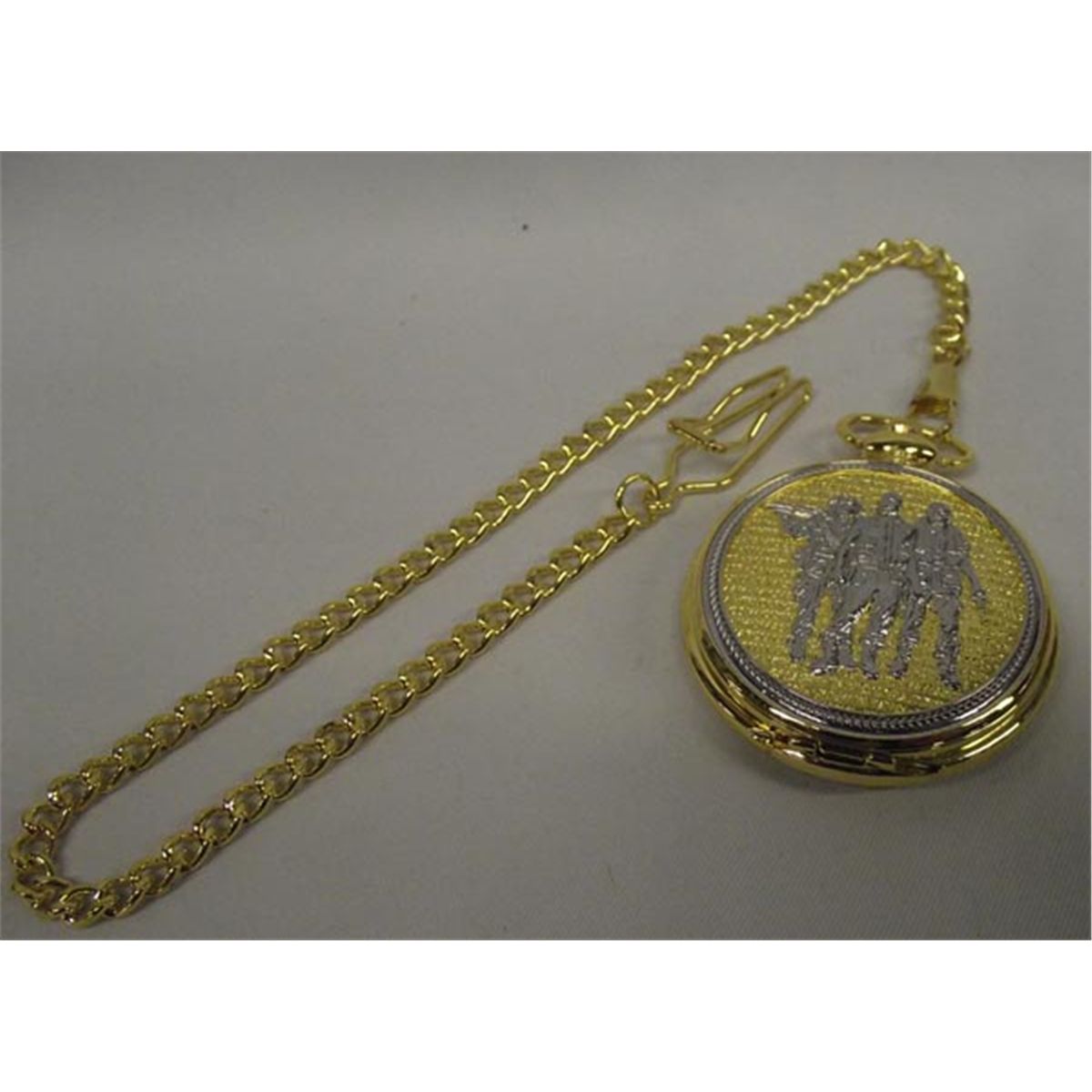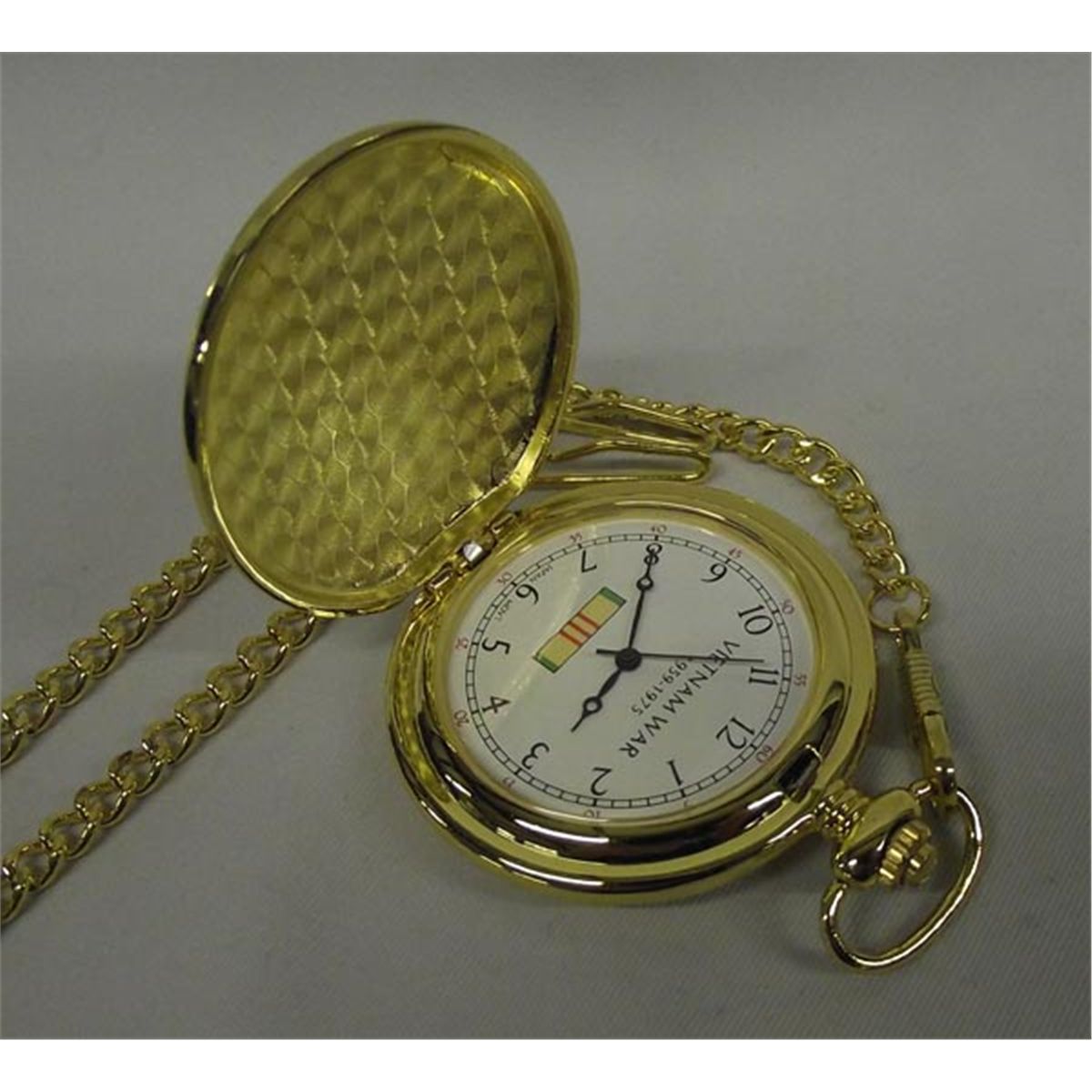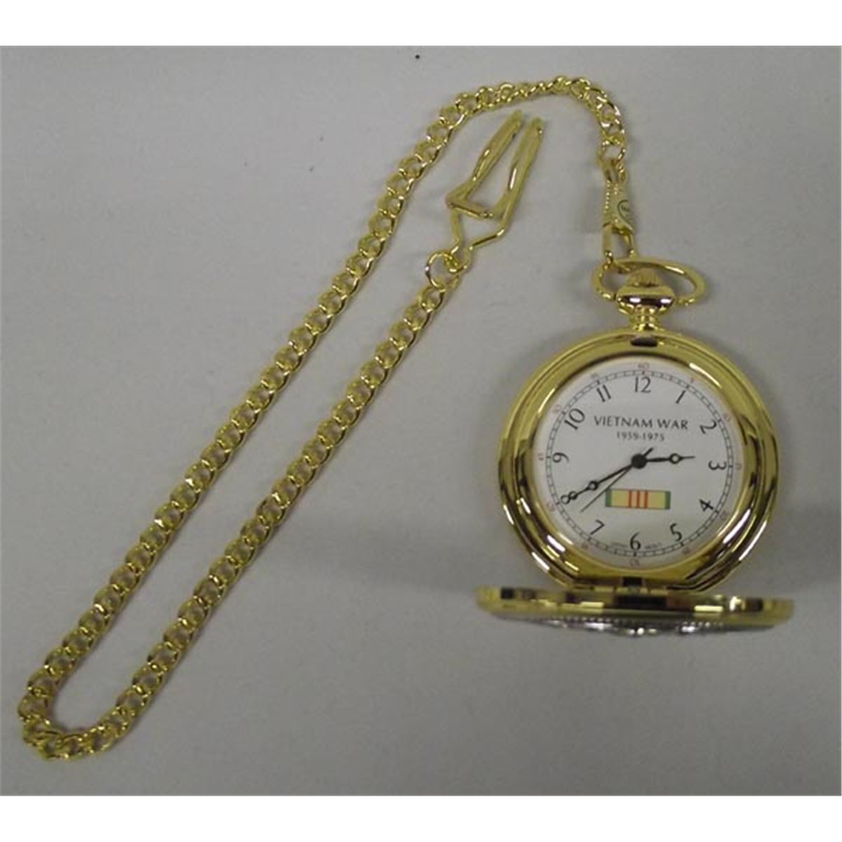 Vietnam Memorial Pocket Watch. 1959-1975 War. Pocket watch with chain. Watch measures approx. 2'' diameter, chain measures approx. 14''. Watch is made in China. In original box. Buyers Pay Actual Shipping and Handling Charges(see terms and conditions for more information).