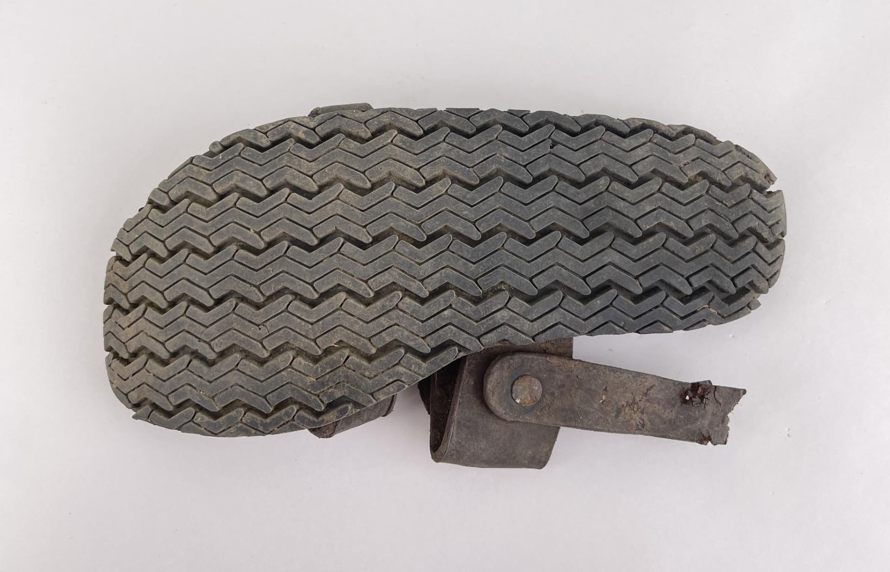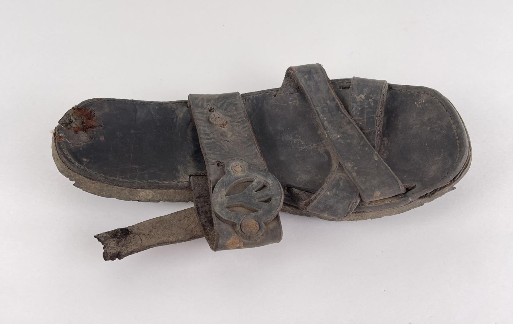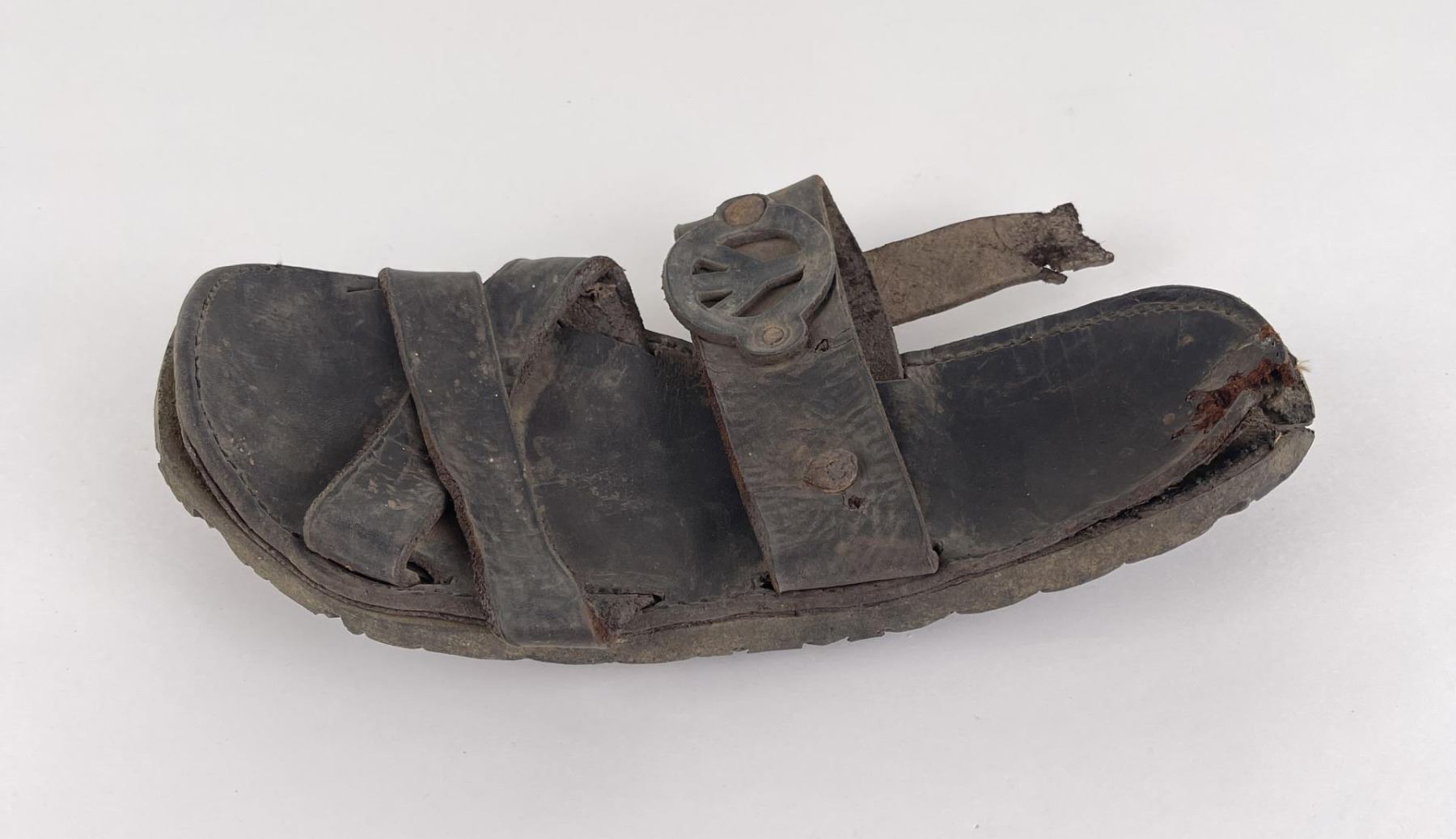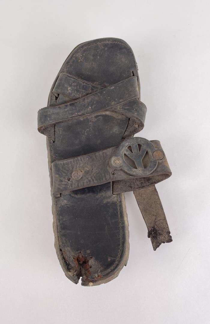 Made by a man captured by the Vietcong during the Vietnam War. Handmade from boot leather and tire rubber. 10 3/8" long.