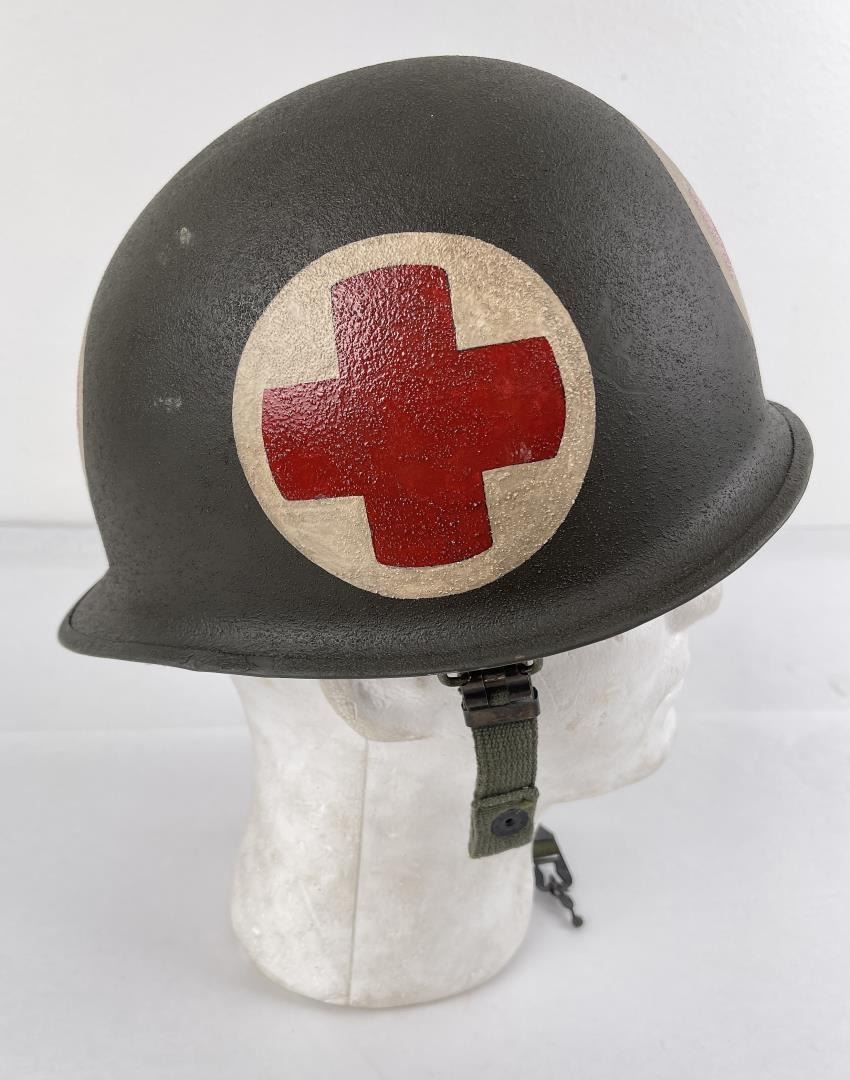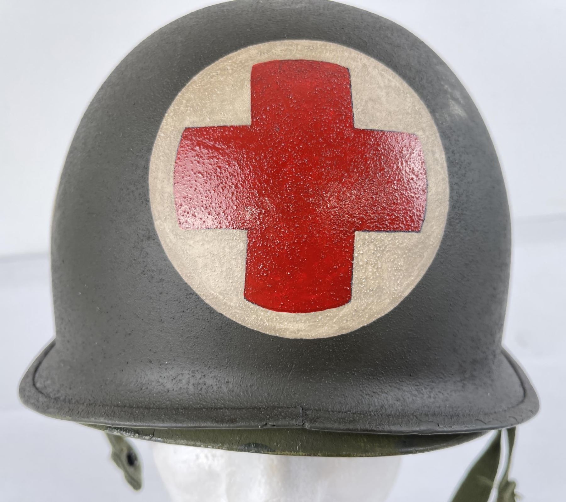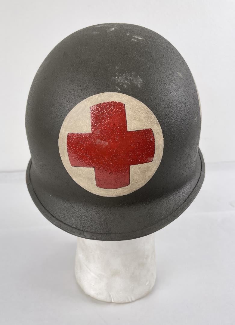 Nice helmet. Has been painted at a later date with the hospital cross.