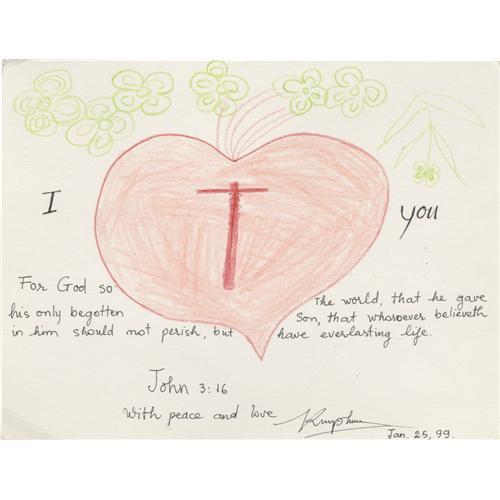 <B>Vietnam War Icon Kim Phúc Original Drawing Signed</B></I> "<I>Kim Phuc</B></I>". 11" x 8.5", dated January 25, 1999, crayon on paper with ink John 3:16 bible verse, in fine condition. Kim Phúc was the subject of possibly the most immediately recognizable photographs to come from the war in Vietnam. The image of the then 9 year old Phúc running naked and burned after a napalm attack on her village was widely circulated at the time. Kim slowly recovered from her horrific burns and in 1992 while on her honeymoon defected to Canada while the plane made a refueling stop. She converted to Christianity from her family's religion of Cao Dai.<BR><BR><b>Shipping:</b> Flat Material, Small (<a target="_blank" href="http://www.heritageauctions.com/common/shipping.php">view shipping information</a>)