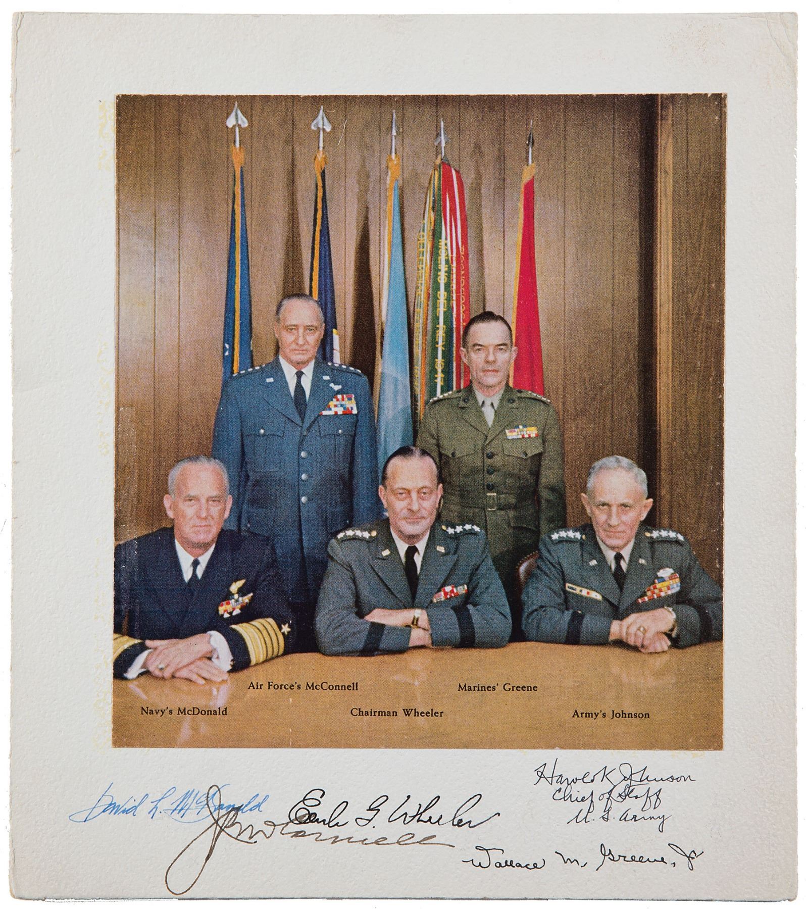 Color 7 x 7.5 magazine photo of the mid-to-late 1960s Joint Chiefs of Staff, affixed to an 8.75 x 10 mount, signed on the mount in ink by all five pictured: David L. McDonald, John P. McConnell, Earle Wheeler, Wallace M. Greene, and Harold K. Johnson. A collector's label on the reverse indicates that it was signed in Washington, DC, in February 1965. In fine condition, with dings to corners.