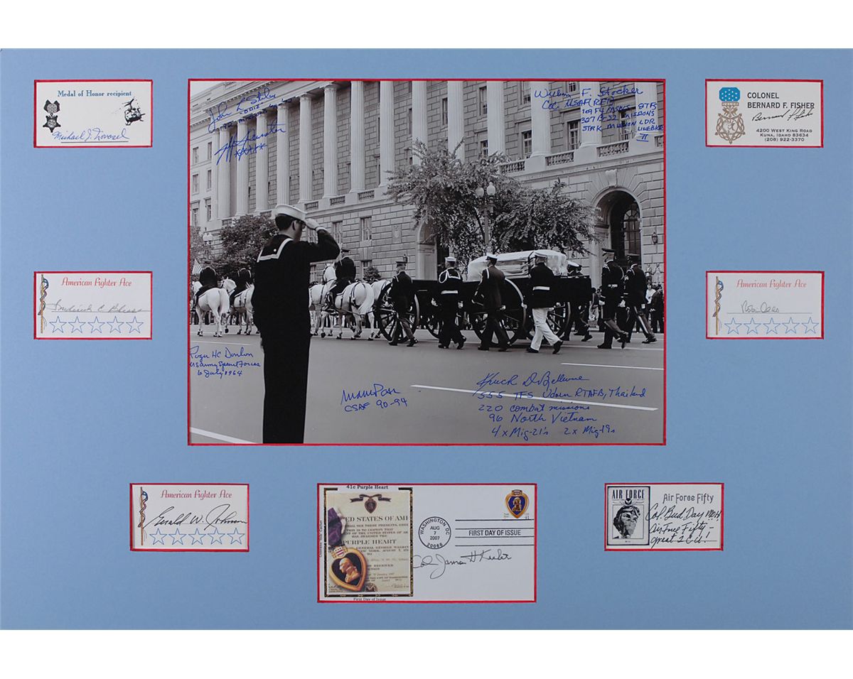 Collection of items consisting of a signed photo, an FDC, and pencil and ink signatures. A glossy 14 x 11 photo of the deceased ‘unknown soldier’ being transported to Arlington National Cemetary on May 30, 1984, signed in blue felt tip by Vietnam veterans John Stiles, Jeff Feinstein, Roger H. C. Donlon, Merrill McPeak, Chuck DeBellevue, and William Stocker; FDC signed in pencil by Colonel James H. Kasler; and signatures of Michael J. Novosel, Frederick C. Blesse, Gerald W. Johnson, Bud Day, Robin Olds, and Bernard Fisher on individual white custom-made collector’s cards. All are double-matted together to an overall size of 25 x 17. In fine condition. Oversized.