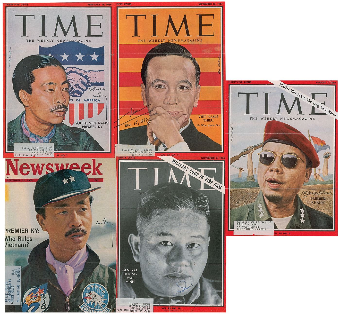Five Newsweek and Time magazine covers from the mid-1960s depicting political and military leaders of Vietnam, each signed in black felt tip by the subject. Includes: Nguyen Van Thieu, Nguyen Cao Ky (2), Duong Van Minh, and Nguyen Kanh. In very good to fine condition, with trimmed edges and two horizontal mailing folds to each. Accompanied by transmittal letters from the office of Prime Minister Ky for both magazine covers.