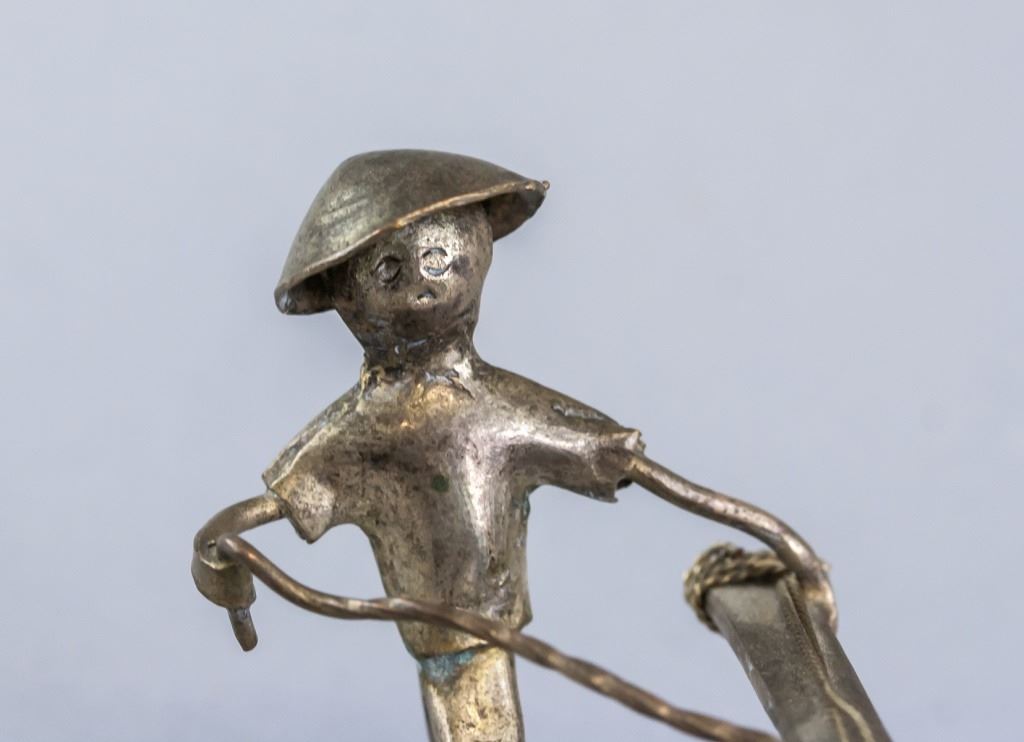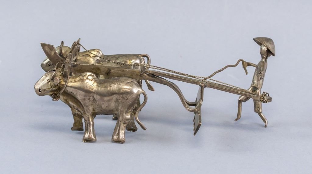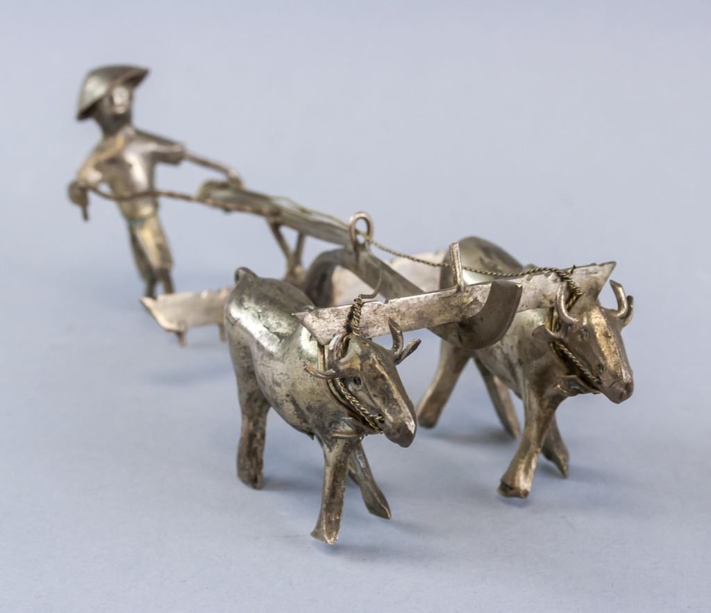 Vietnamese silver-colored statue. Depicting a farmer driving a cow pulling a plow. 5 x 15 cm, 103 grams.